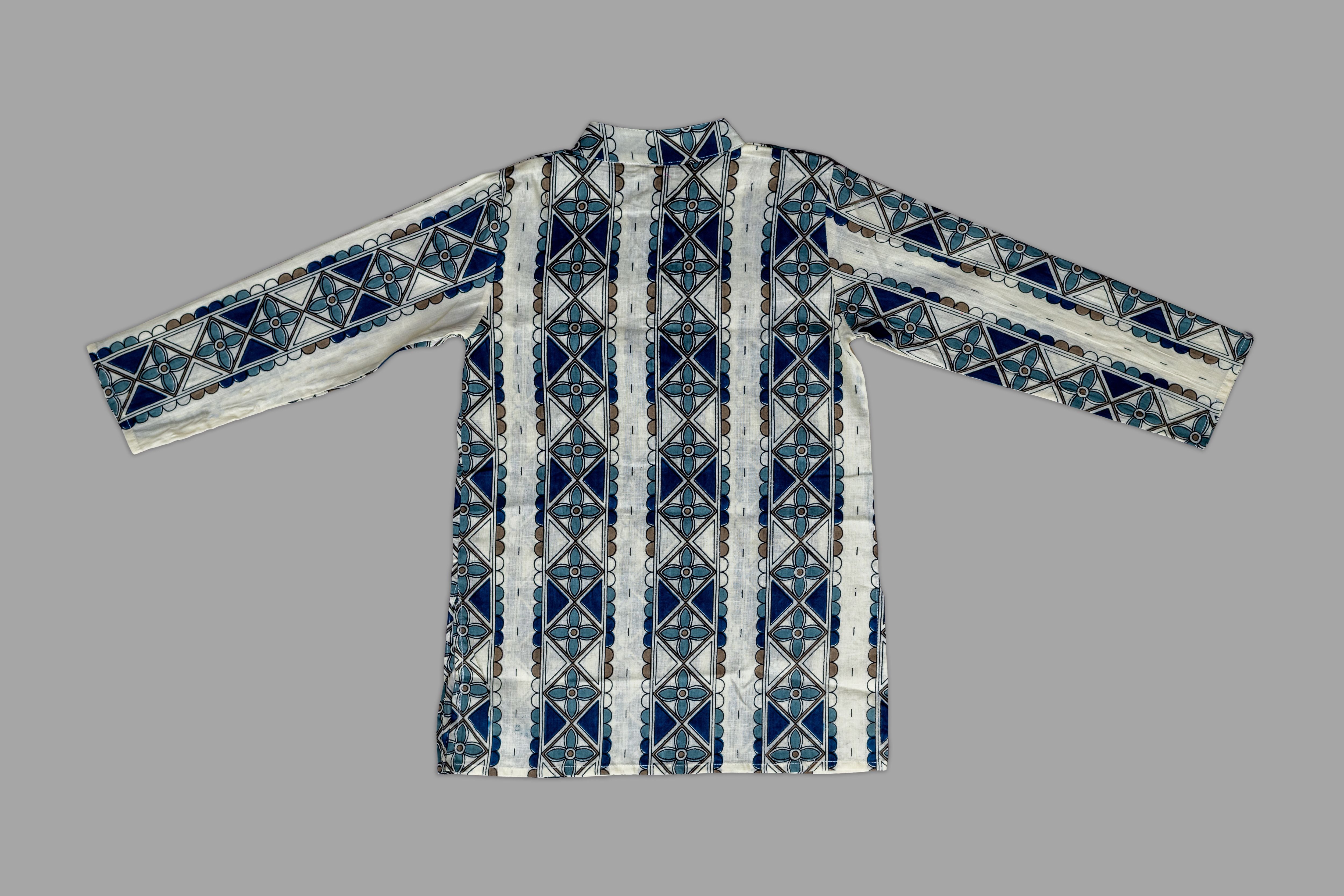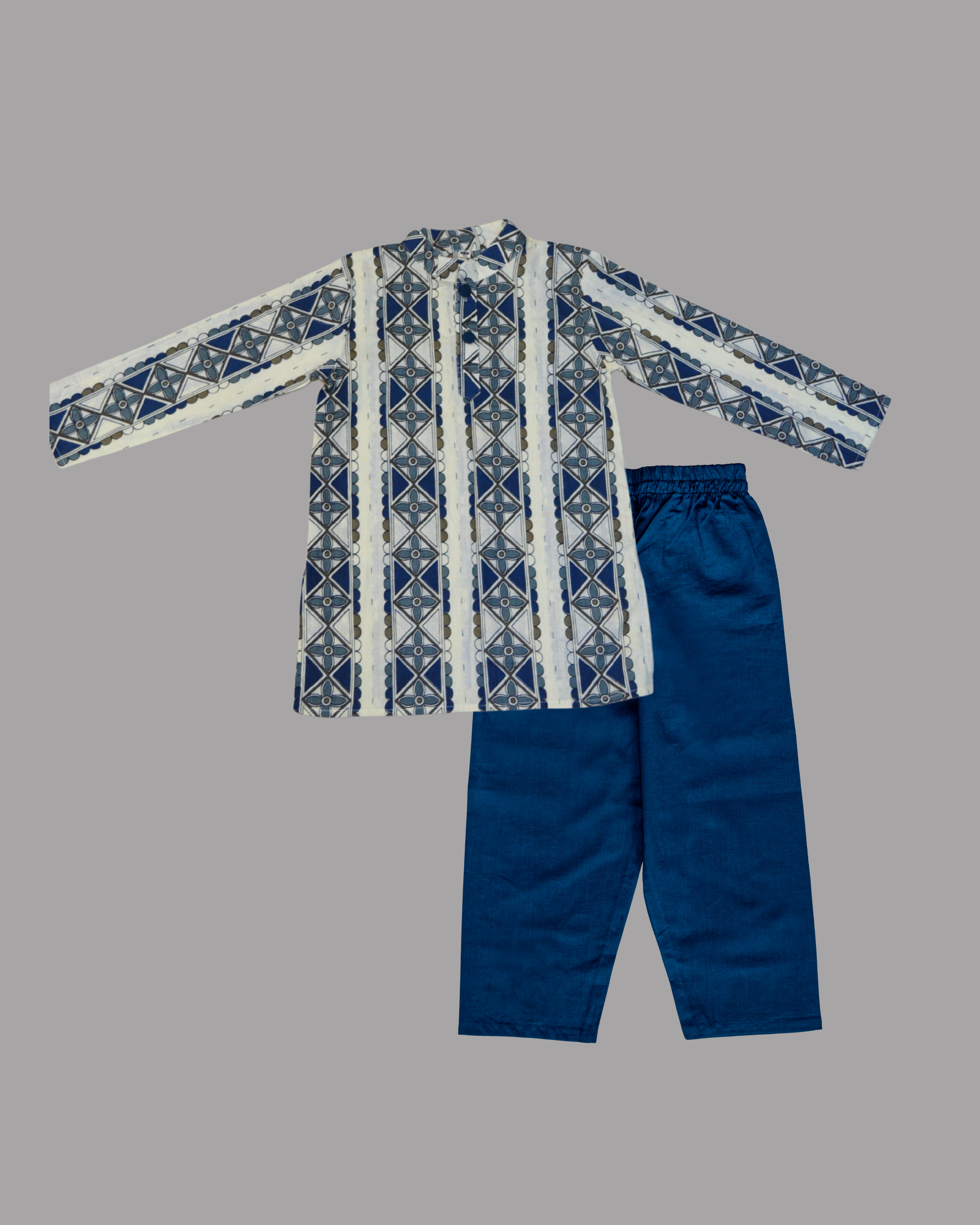 Dress your little one in style and comfort with this elegant Boys Kurta Pyjama Set. The set features a beautifully printed kurta with geometric patterns in shades of blue, white, and grey, paired with solid blue pyjamas for a smart and traditional look. Made from soft, breathable fabric, this outfit is perfect for festive occasions, weddings, cultural events, or family gatherings.