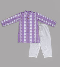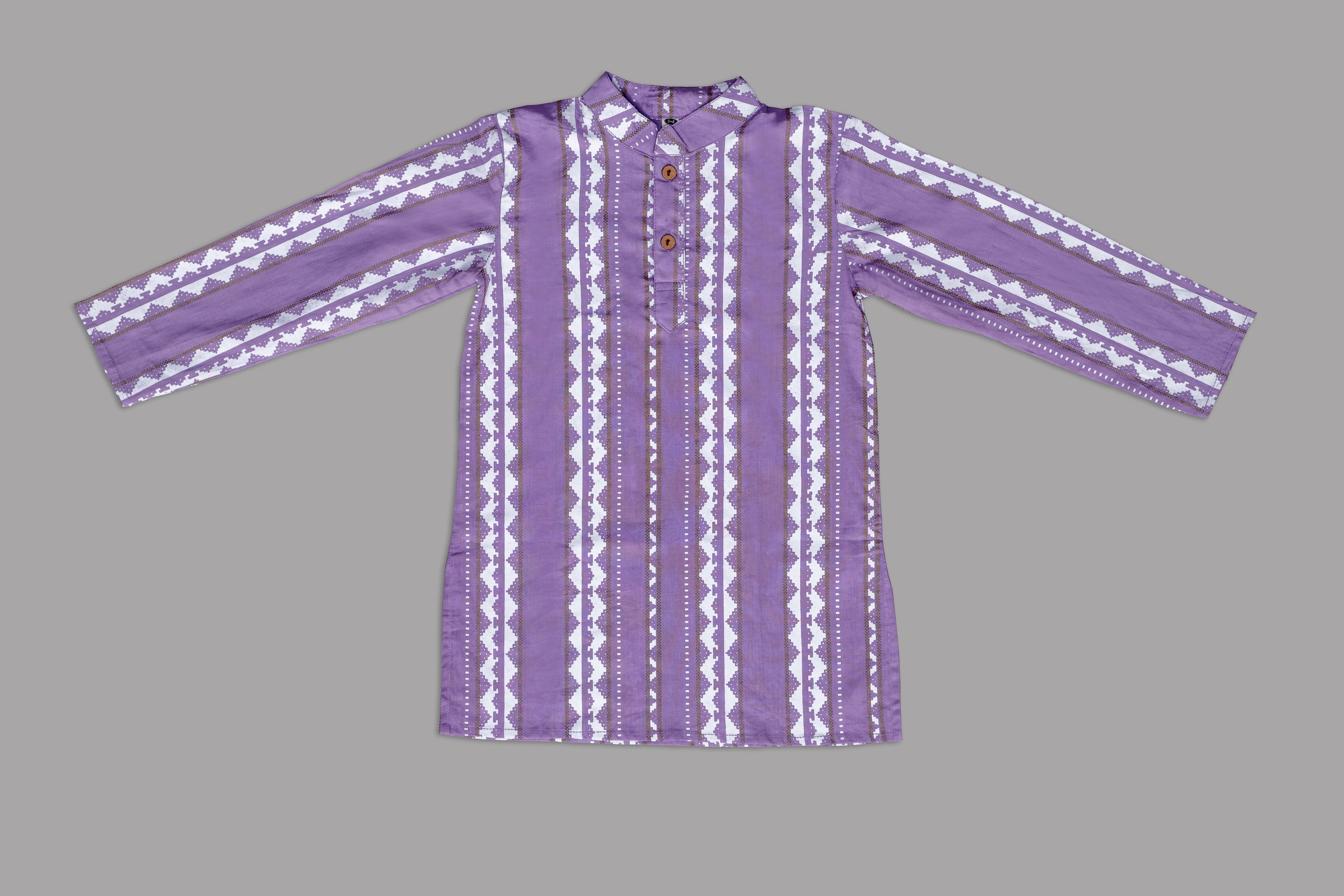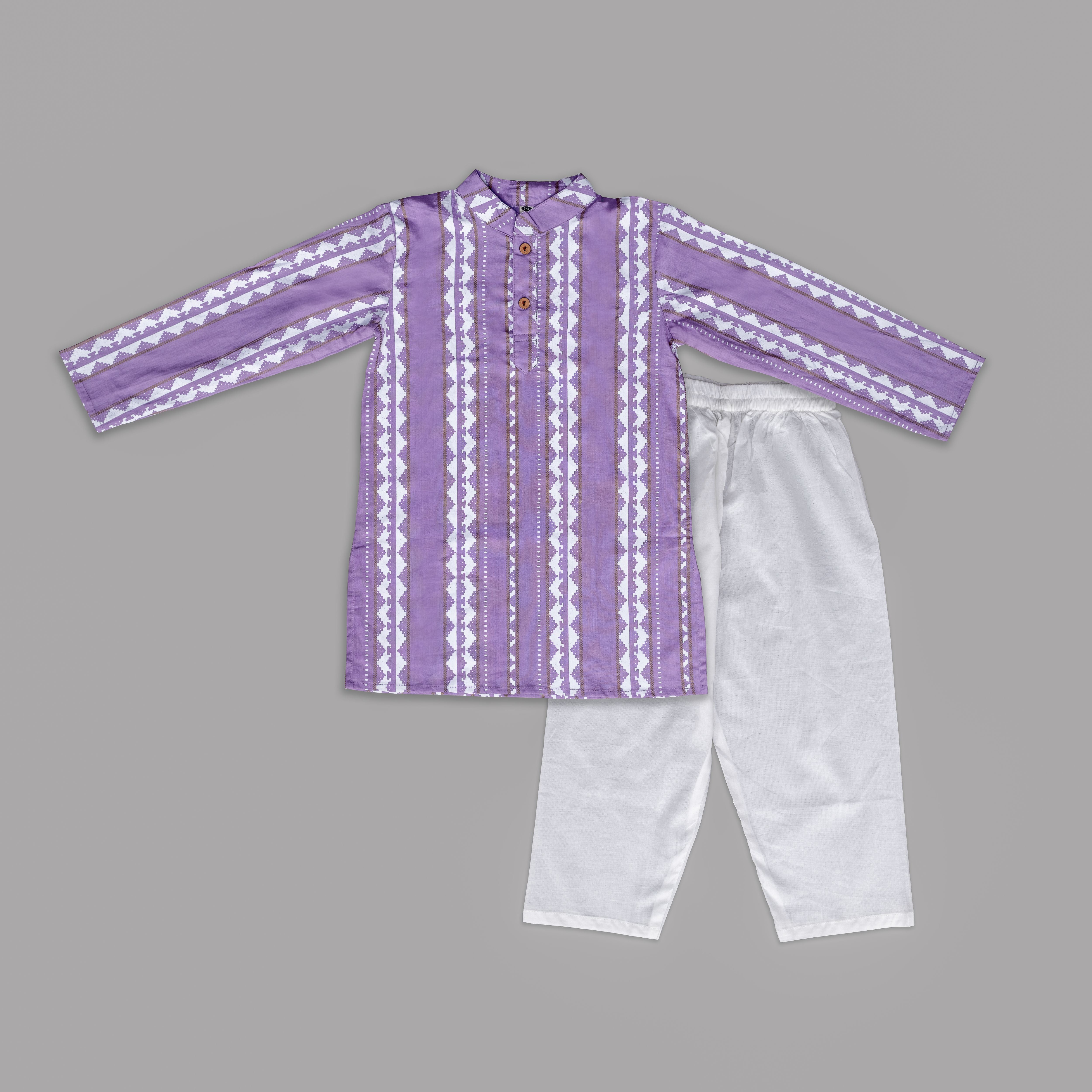 Bright, bold, and beautifully traditional — this purple striped kurta paired with classic white pajamas brings effortless style to any festive occasion. Crafted in breathable cotton with subtle detailing, it’s perfect for playful comfort while still looking celebration-ready.