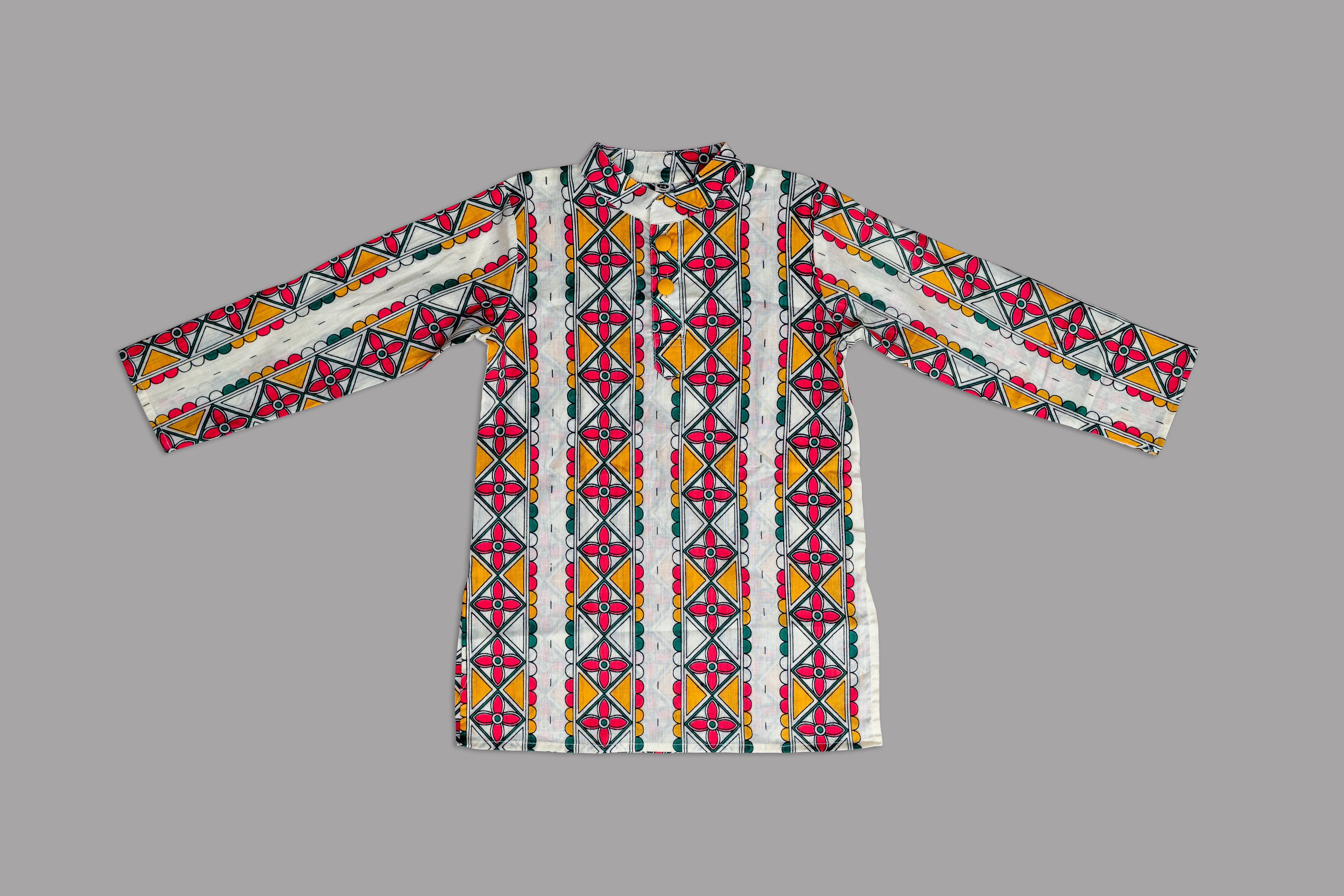 Bring festive charm and everyday comfort together with our Vibrant Geometric Print Kurta Pajama Set, designed specially for boys aged 6 months to 10 years.