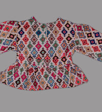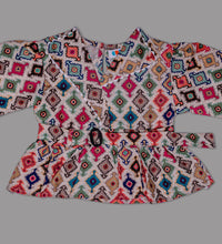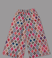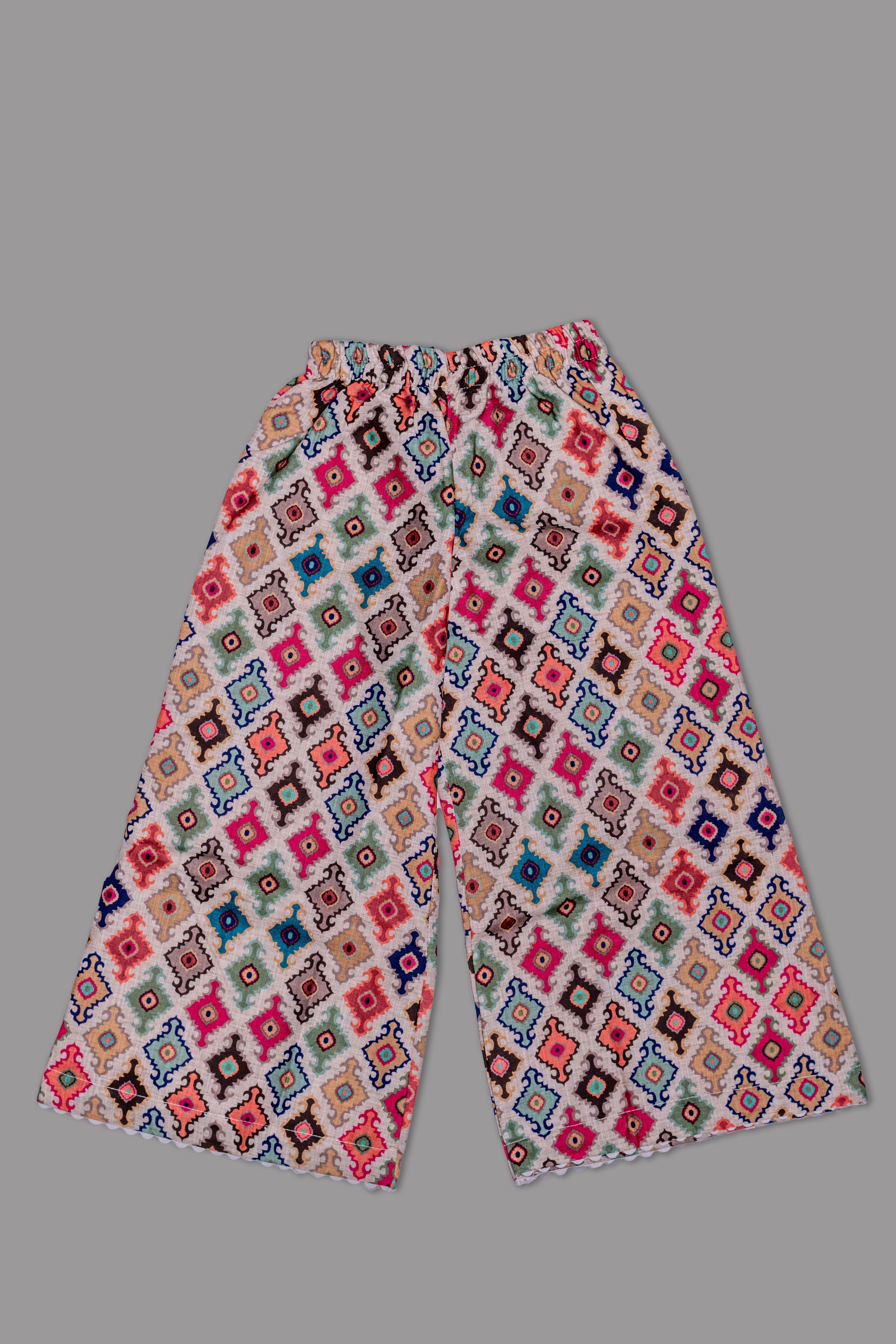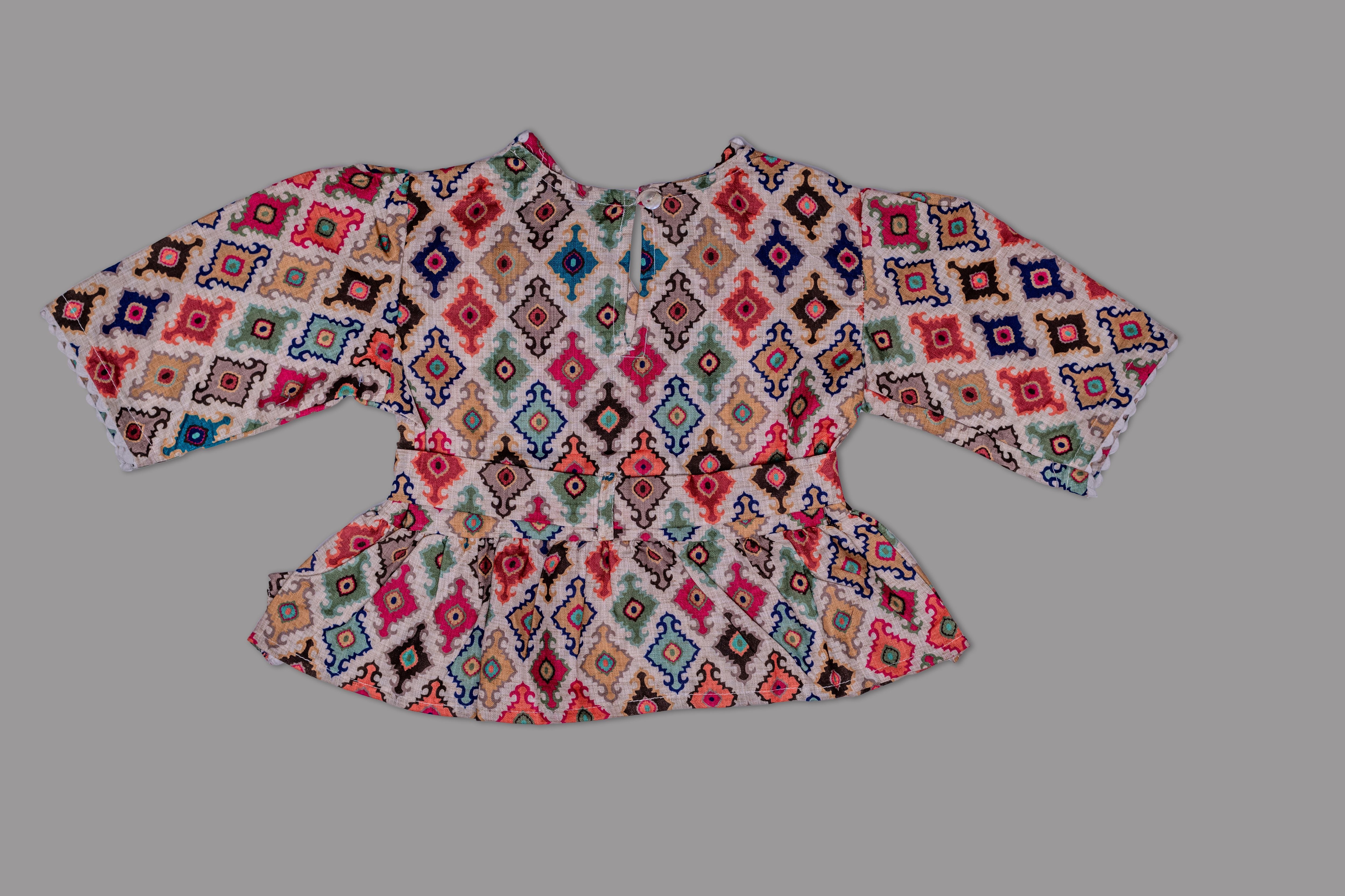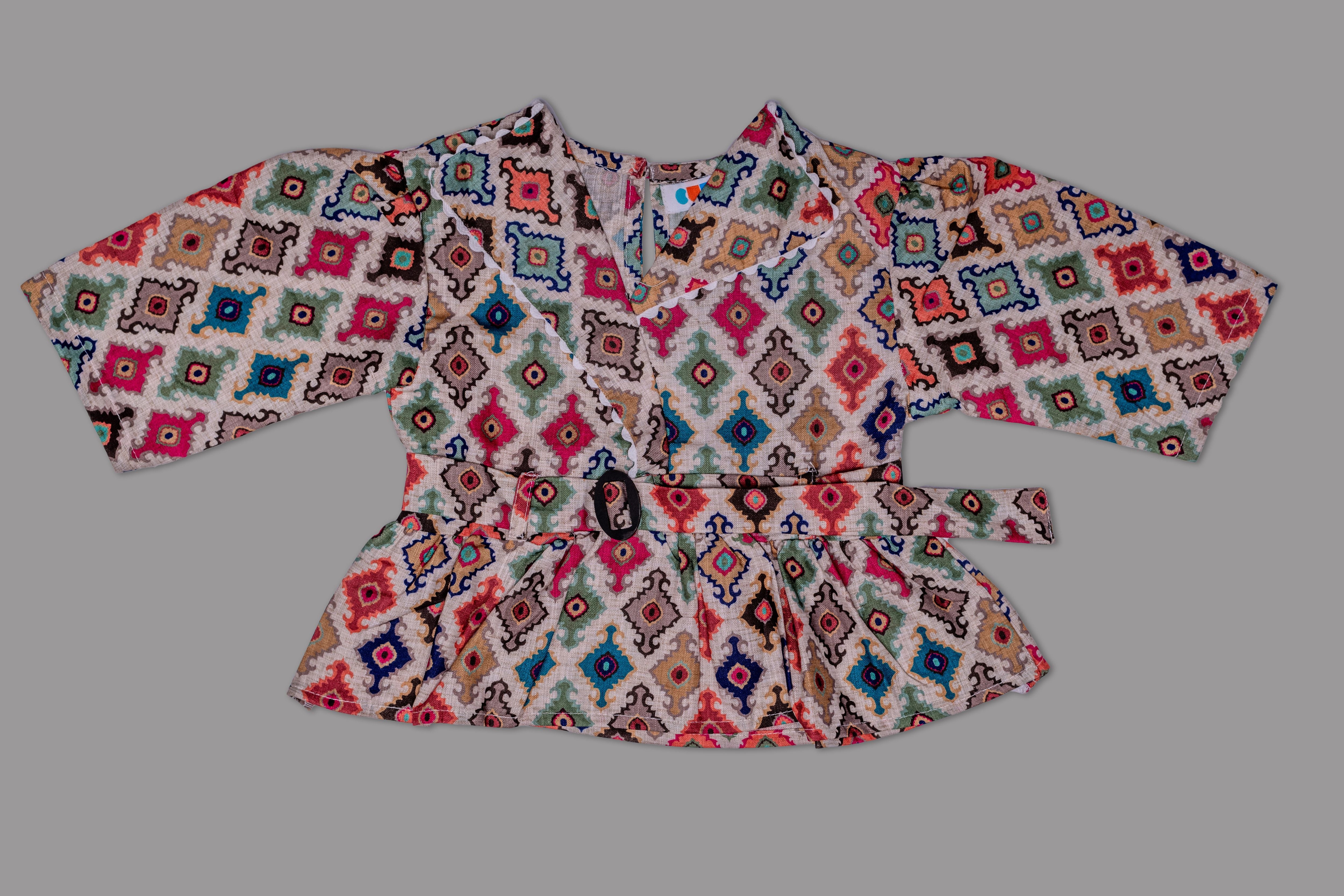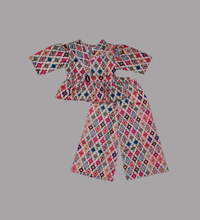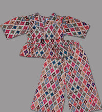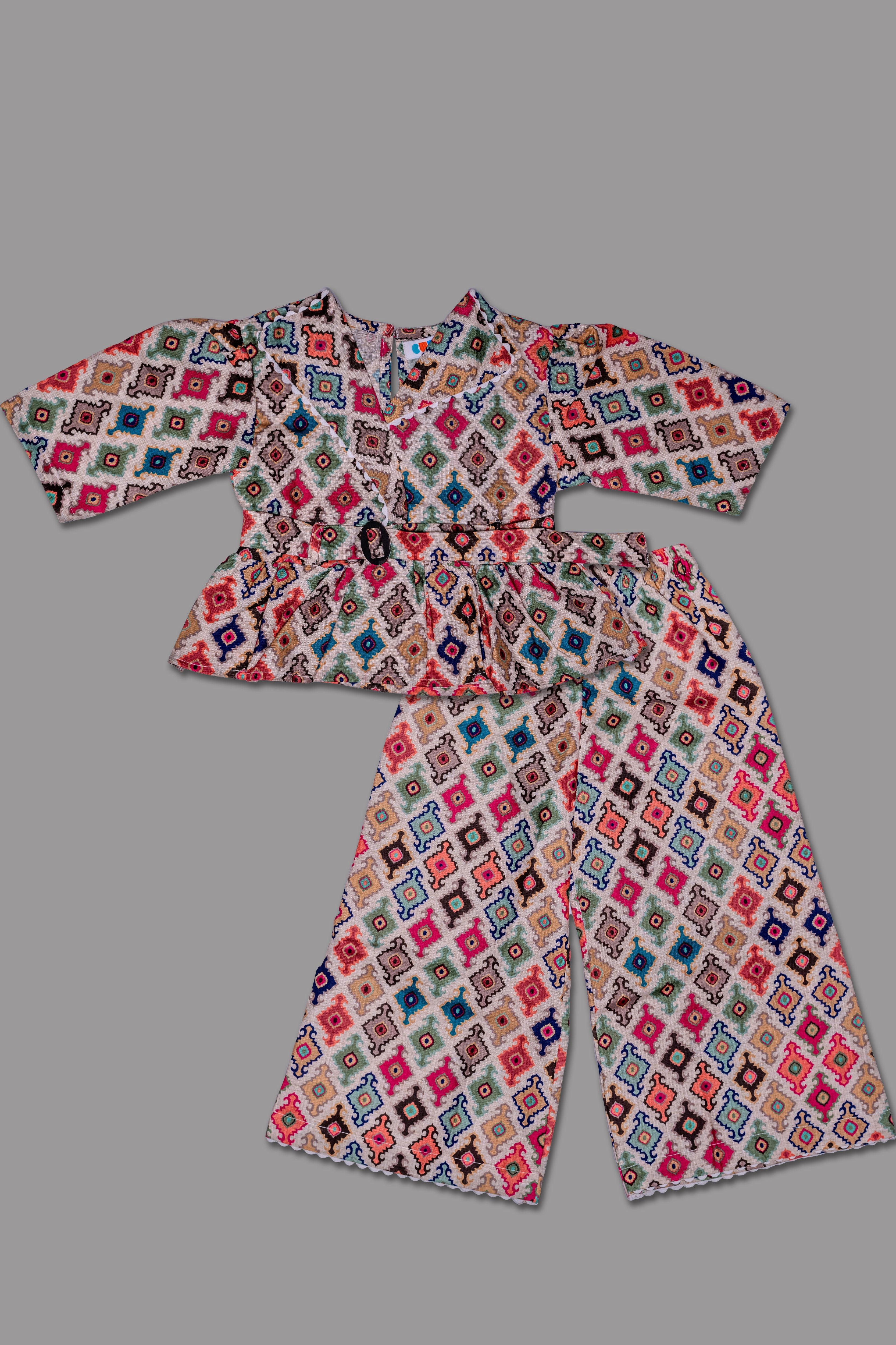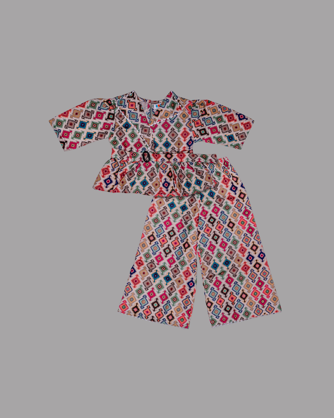 This vibrant kids’ co-ord set features a colorful all-over geometric print that brings fun and freshness to any wardrobe. The top comes with long sleeves, a stylish V-neckline, and a cute peplum waist accented with a buckle detail, offering both comfort and charm. Paired with matching wide-leg pants designed with a soft elastic waistband, the outfit ensures easy movement and all-day comfort. Made from soft, breathable thick linen fabric that’s gentle on the skin, this co-ord set is perfect for playdates, outings, festive occasions, or everyday wear, keeping your child both stylish and comfortable.