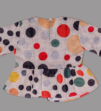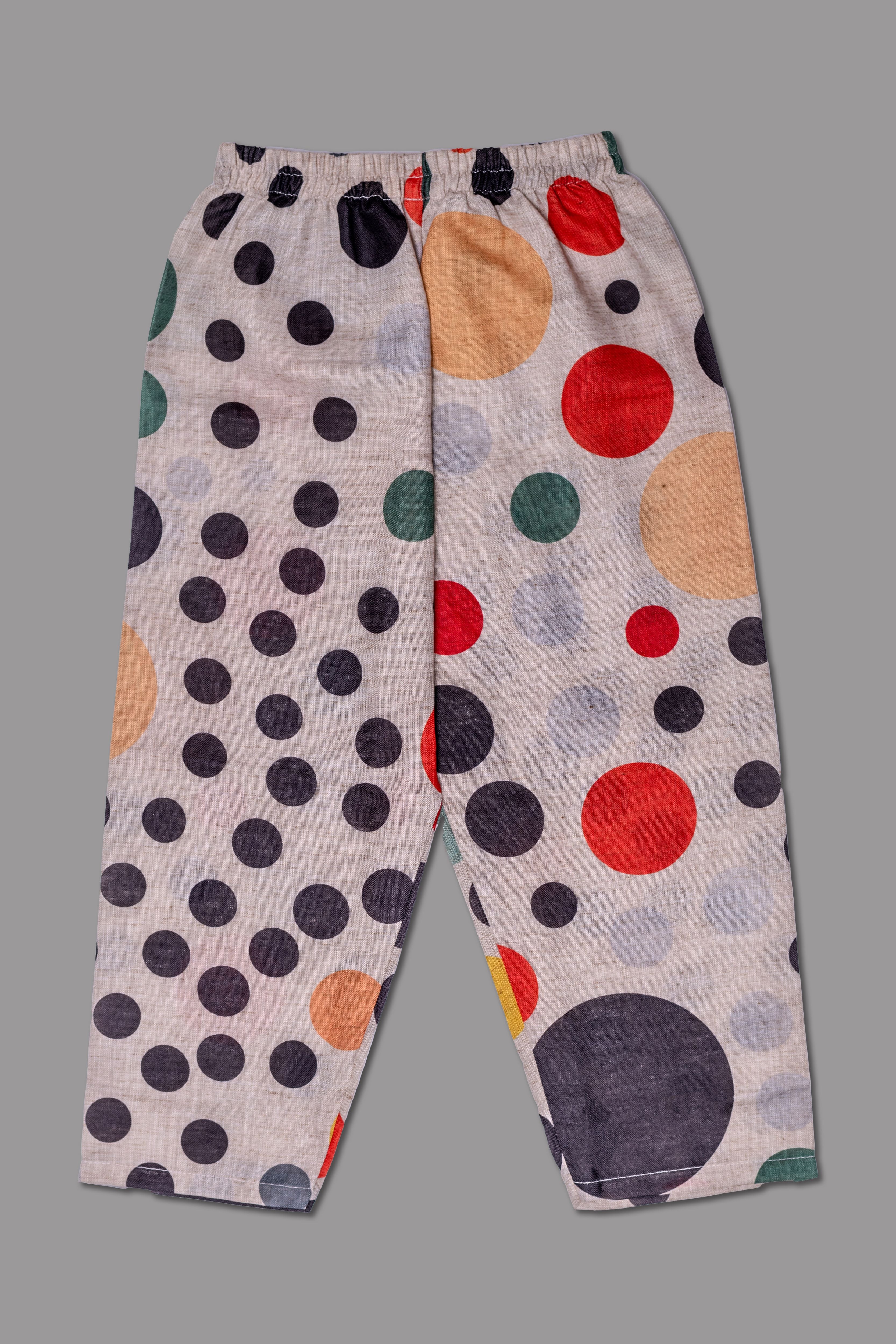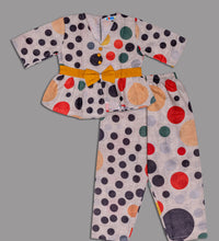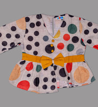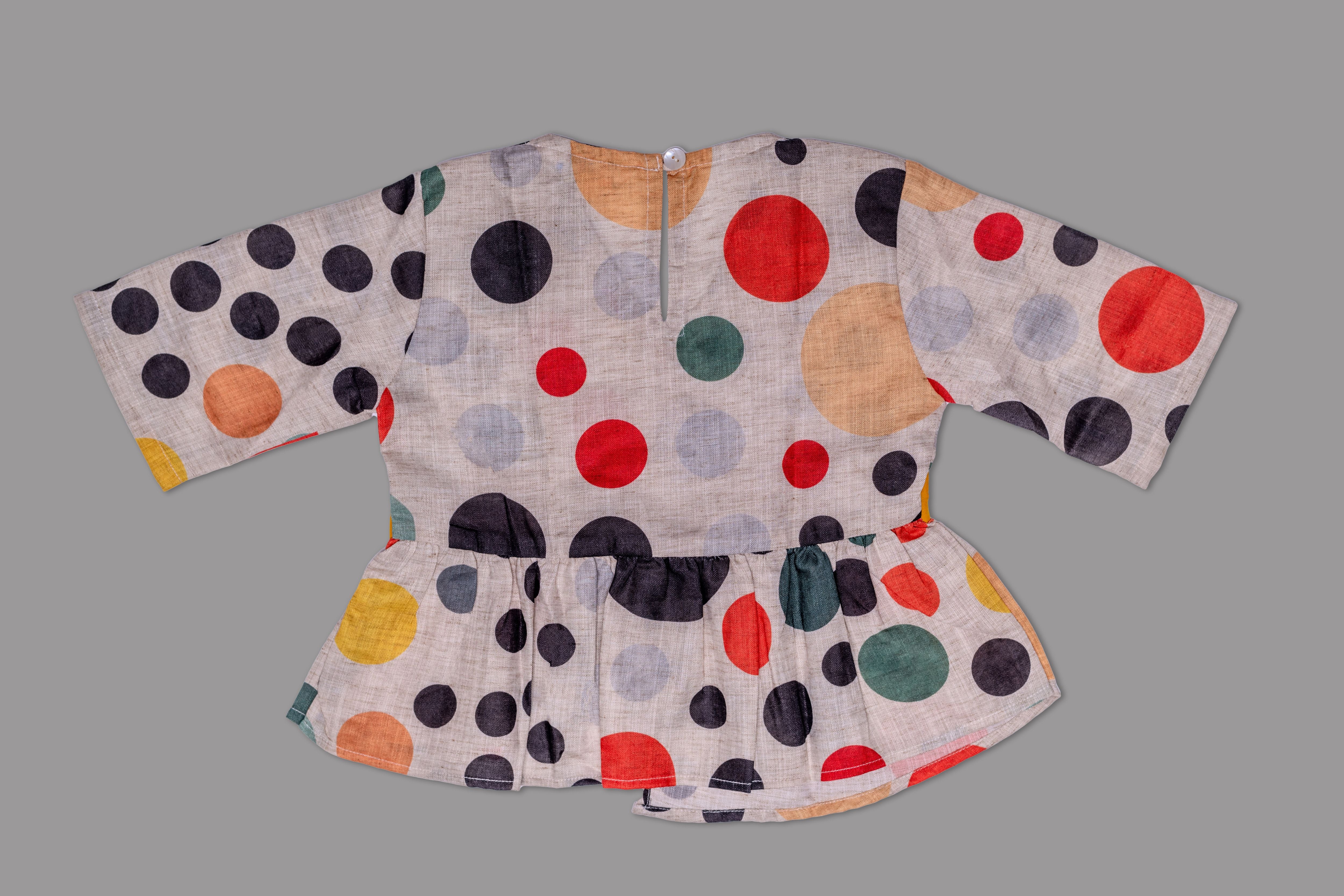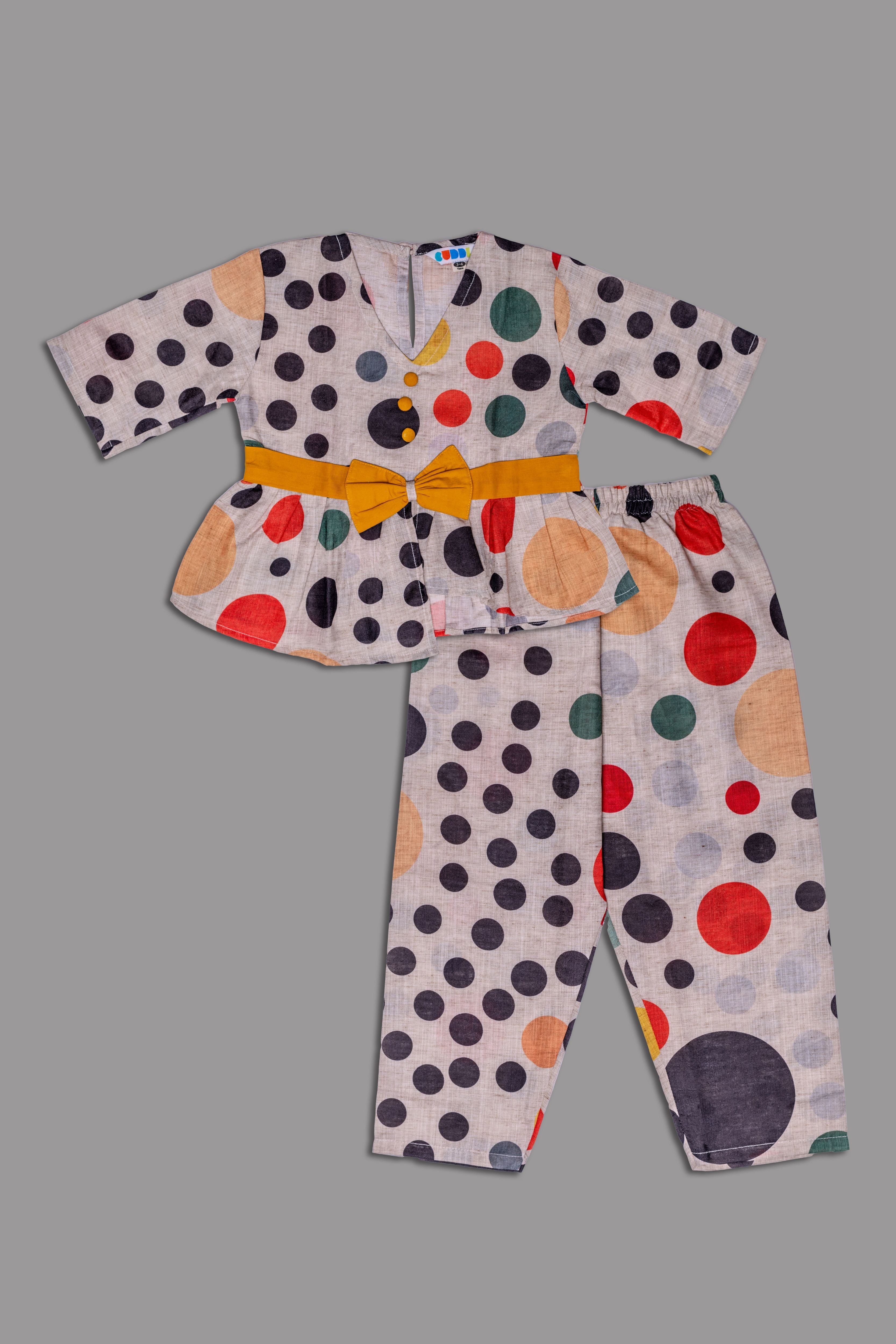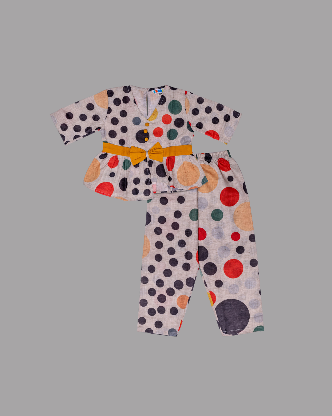 This playful kids’ co-ord set features a lively multicolor polka dot print that adds a cheerful touch to your little one’s wardrobe. The top is designed with a stylish V-neck, cute button detailing, and a peplum flare, highlighted by a mustard bow belt that brings extra charm and color contrast. Paired with matching printed pants that offer a relaxed and comfortable fit, the outfit is made from soft, breathable thick linen fabric perfect for all-day wear. Fun, vibrant, and easy to move in, this coord set is ideal for outings, celebrations, playdates, or everyday comfort with a stylish twist.