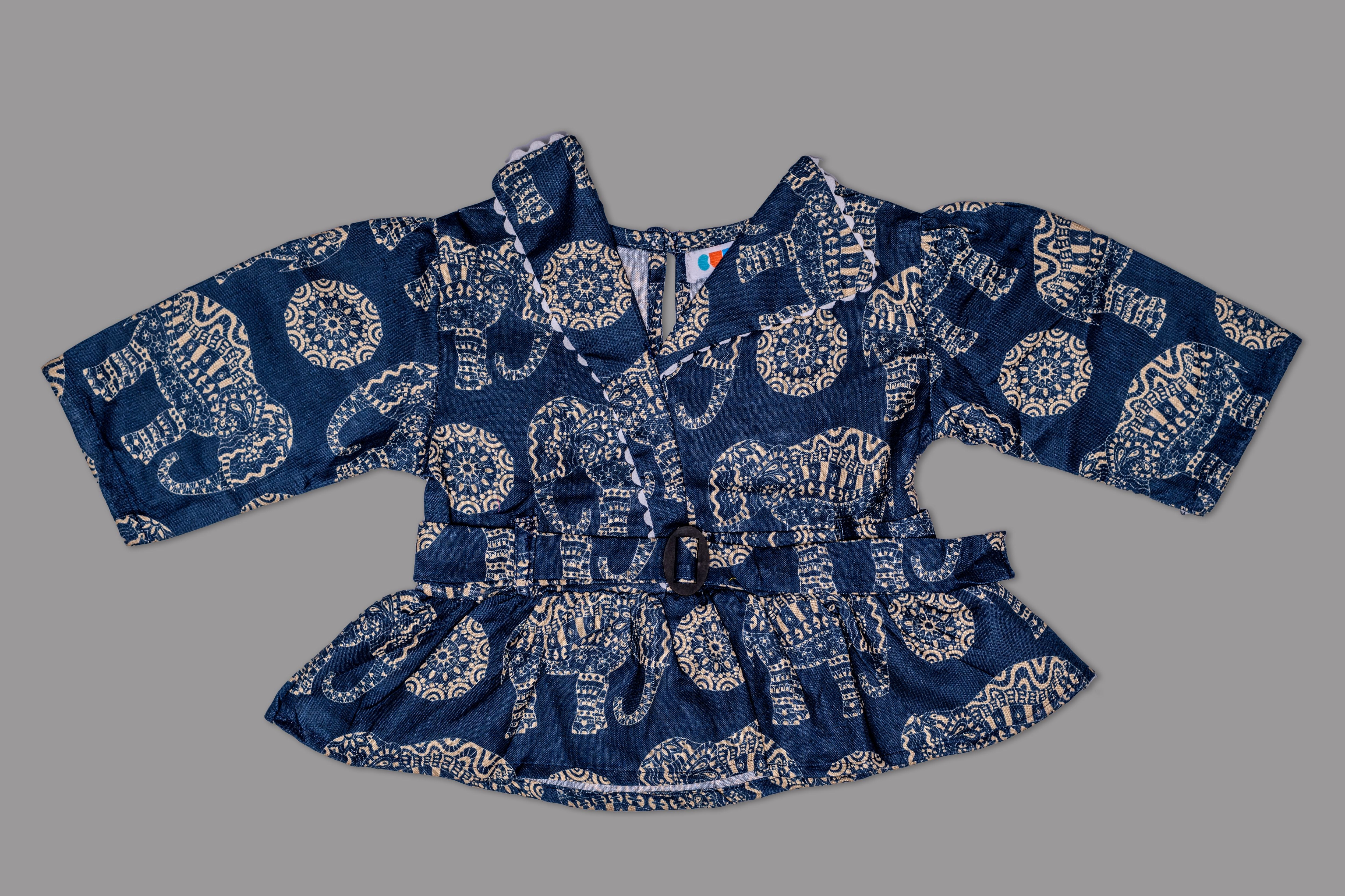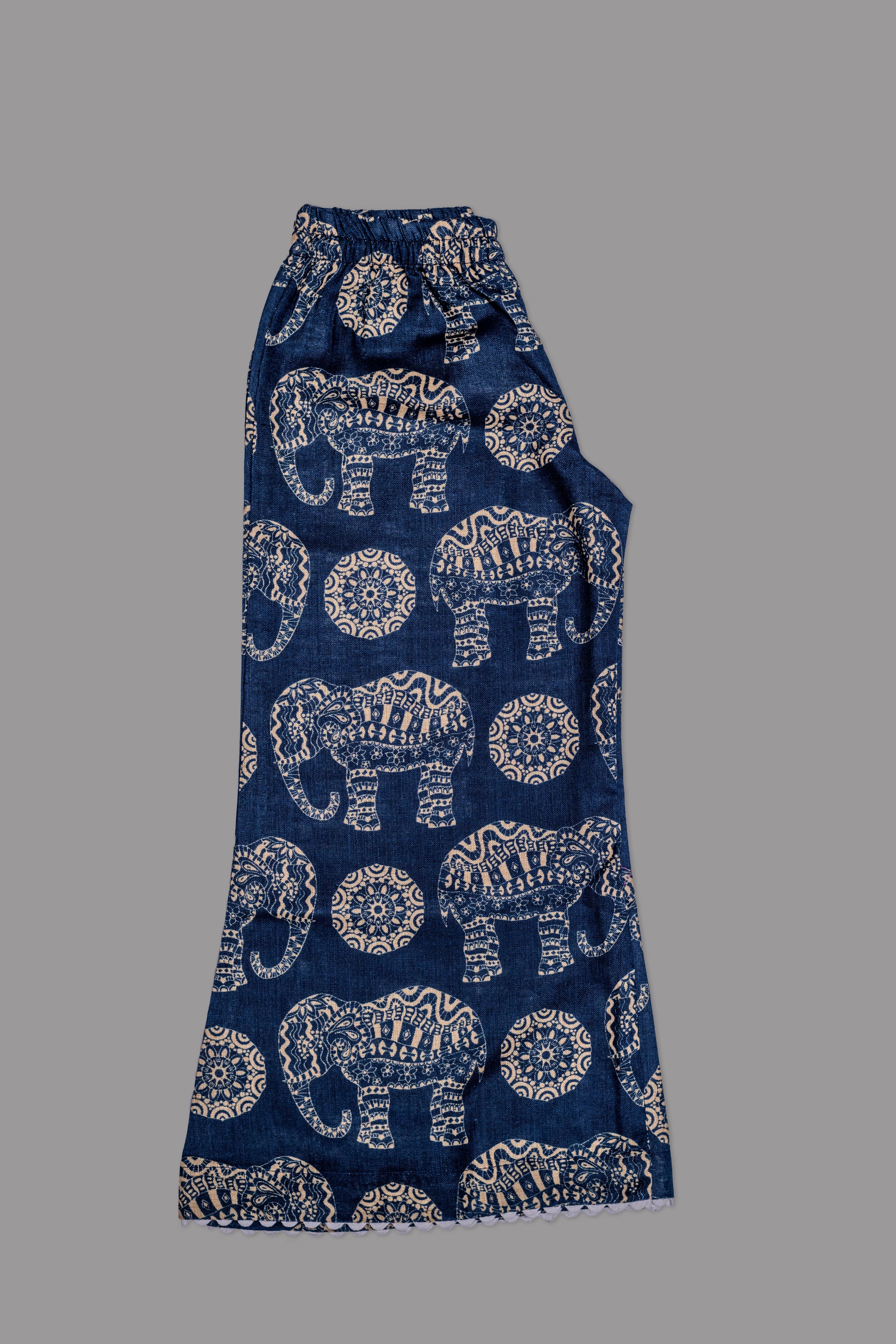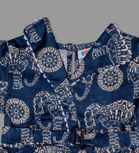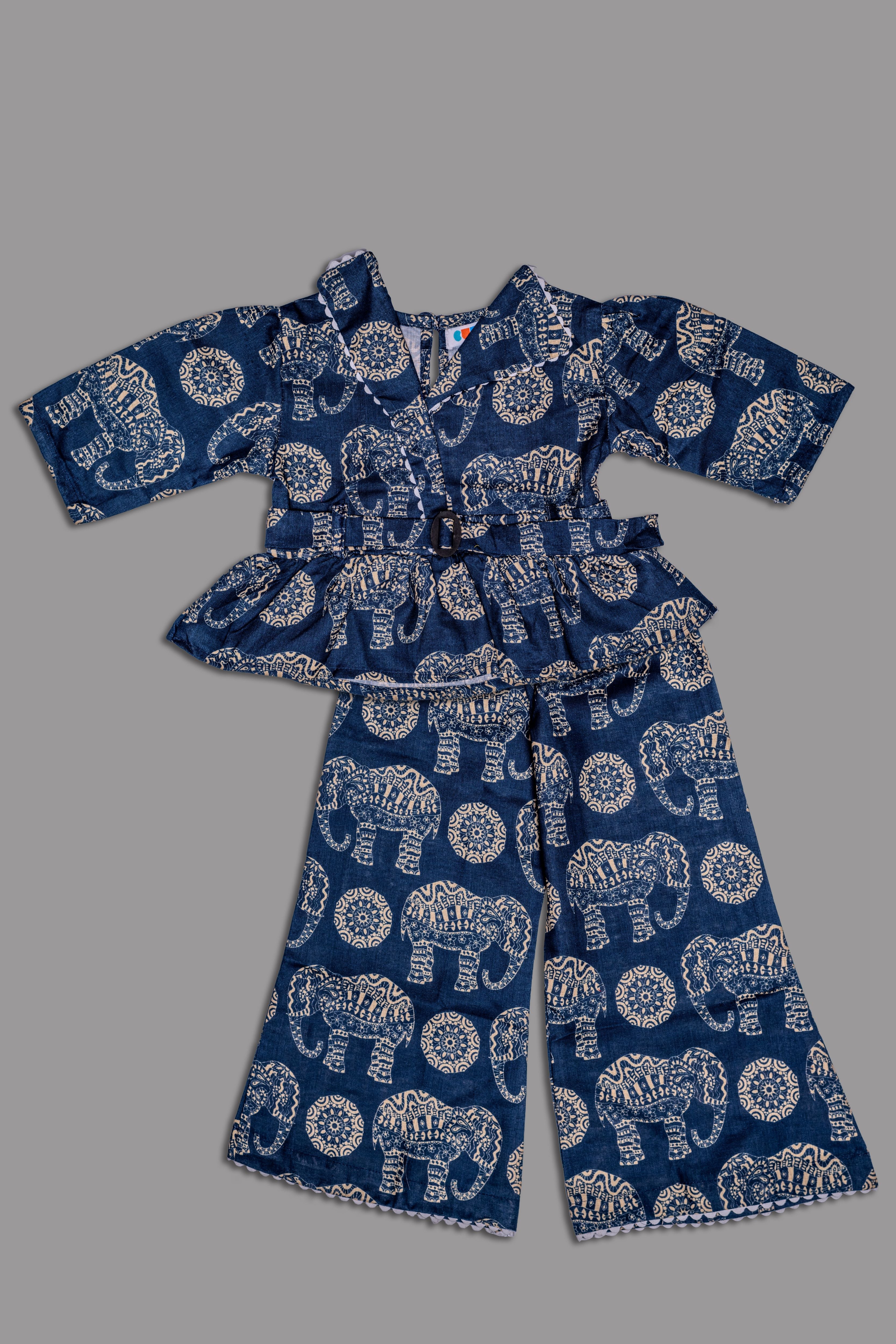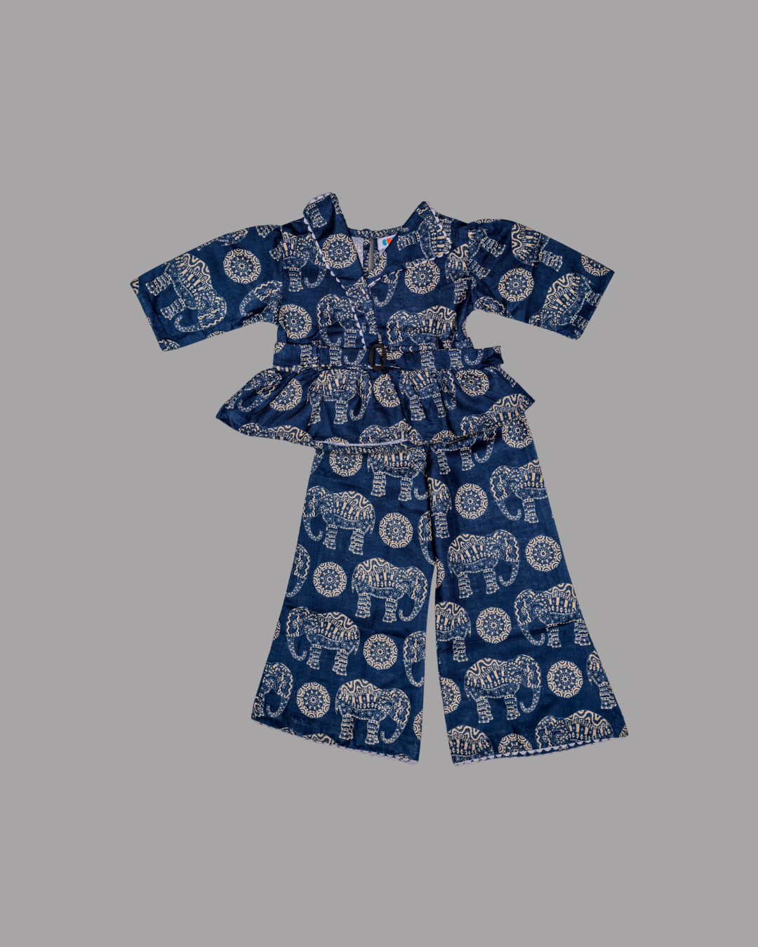 Add a touch of ethnic charm to your little one’s wardrobe with this adorable Navy Blue Elephant Print Cotton Co-ord Set. Crafted from soft, breathable cotton, this outfit ensures all-day comfort and style. The set includes a wrap-style top with a peplum flare and matching wide-leg pants, both adorned with traditional hand-block-style elephant and mandala motifs in soothing indigo and beige hues.