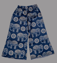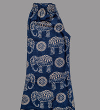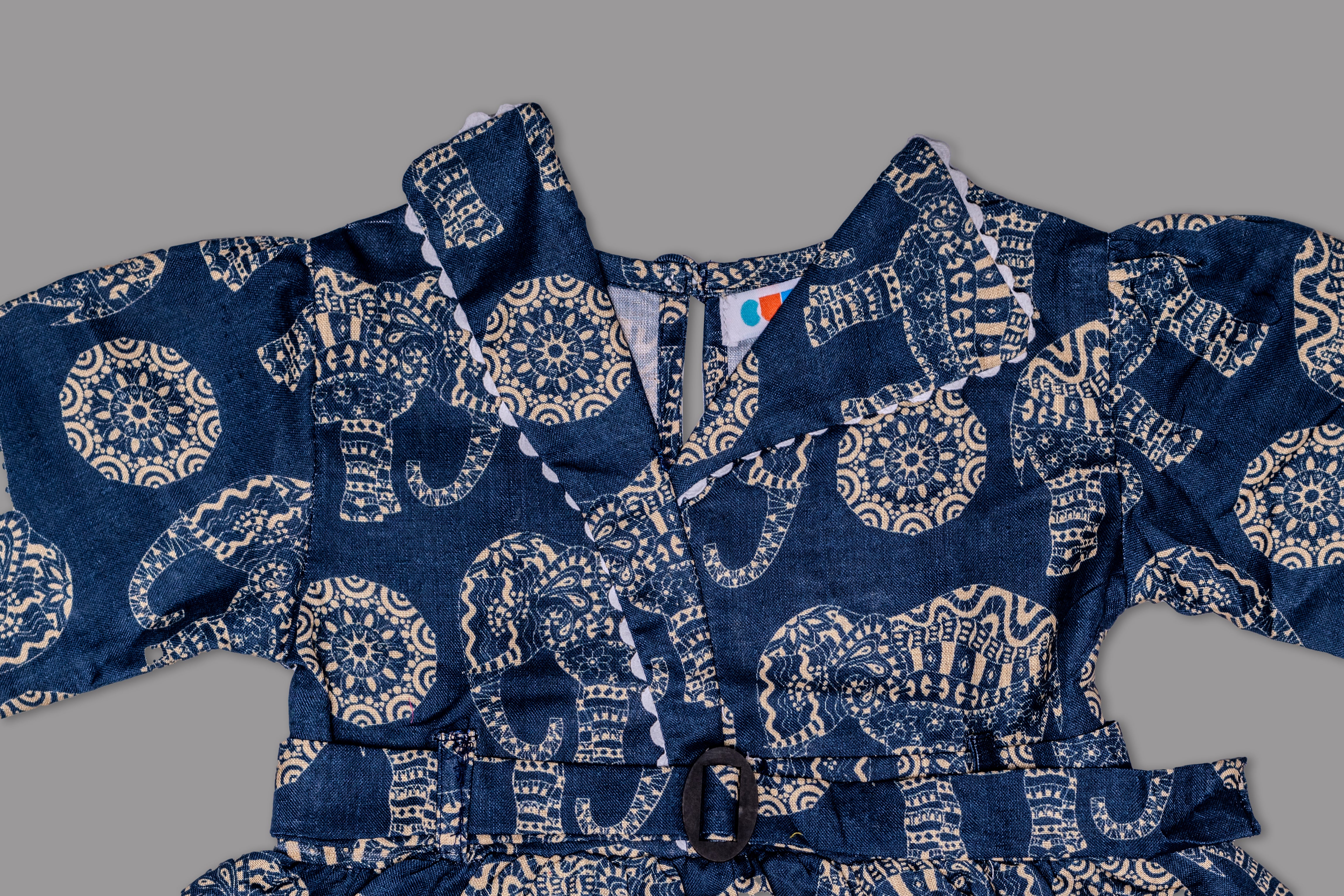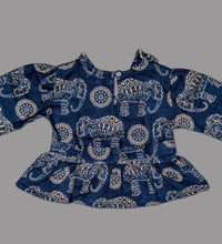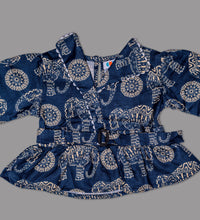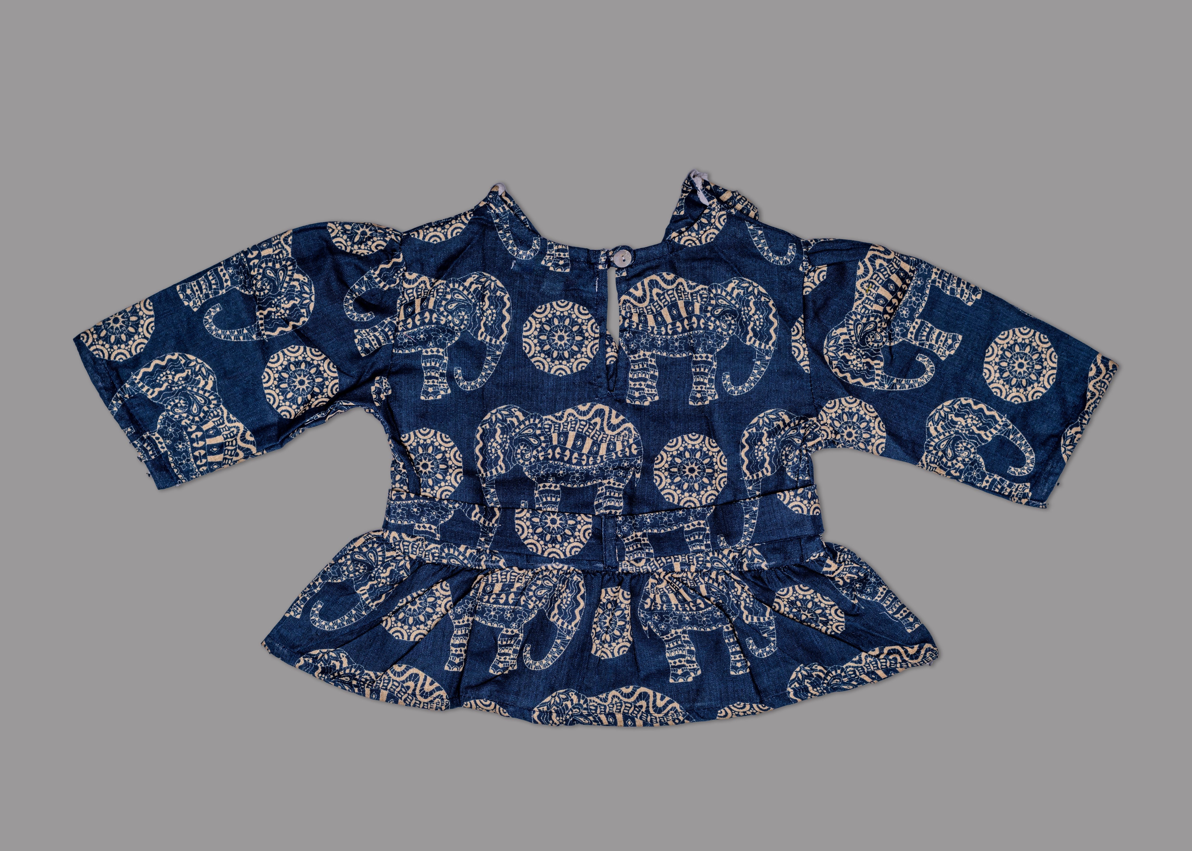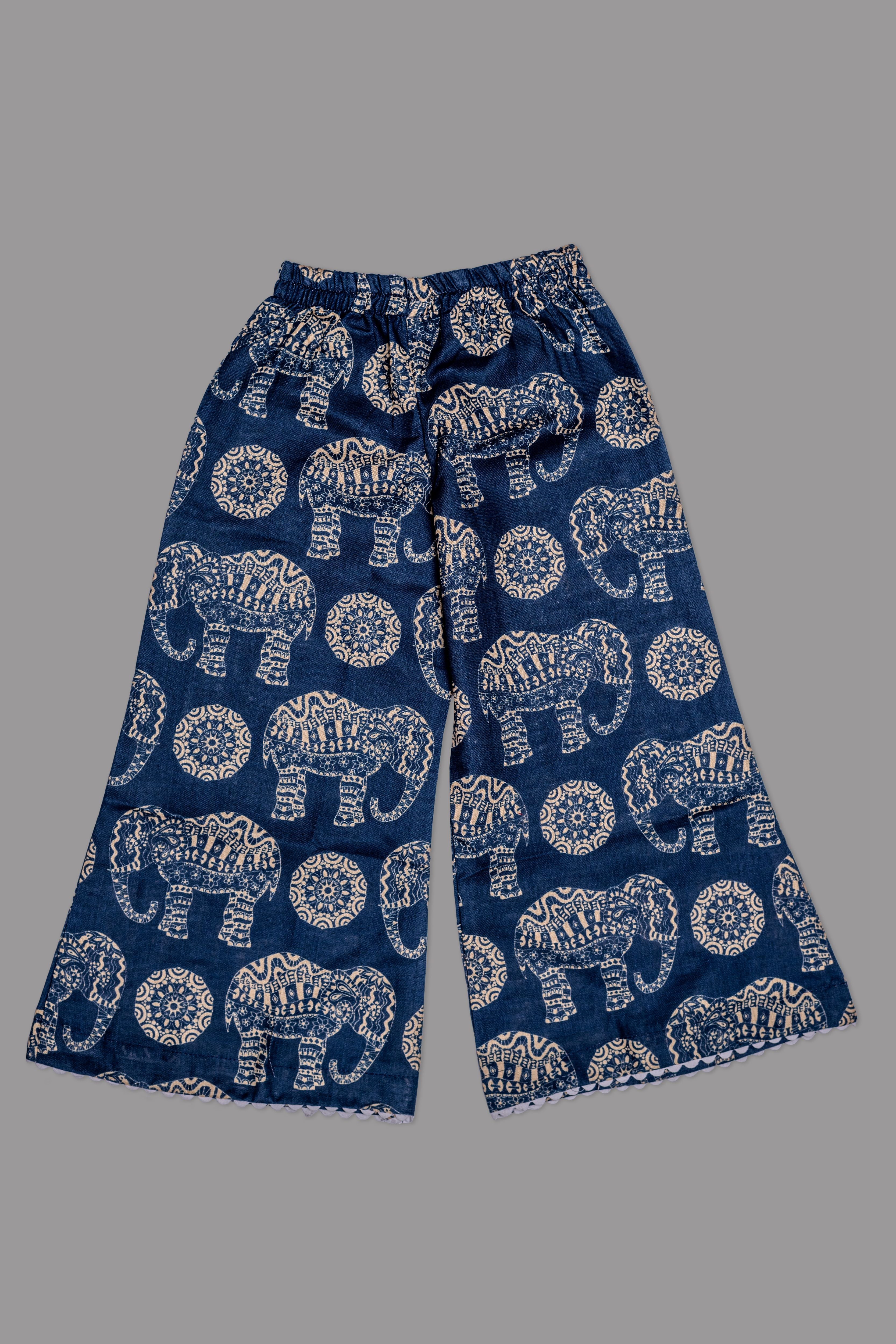 Add a touch of ethnic charm to your little one’s wardrobe with this adorable Navy Blue Elephant Print Cotton Co-ord Set. Crafted from soft, breathable cotton, this outfit ensures all-day comfort and style. The set includes a wrap-style top with a peplum flare and matching wide-leg pants, both adorned with traditional hand-block-style elephant and mandala motifs in soothing indigo and beige hues.