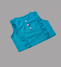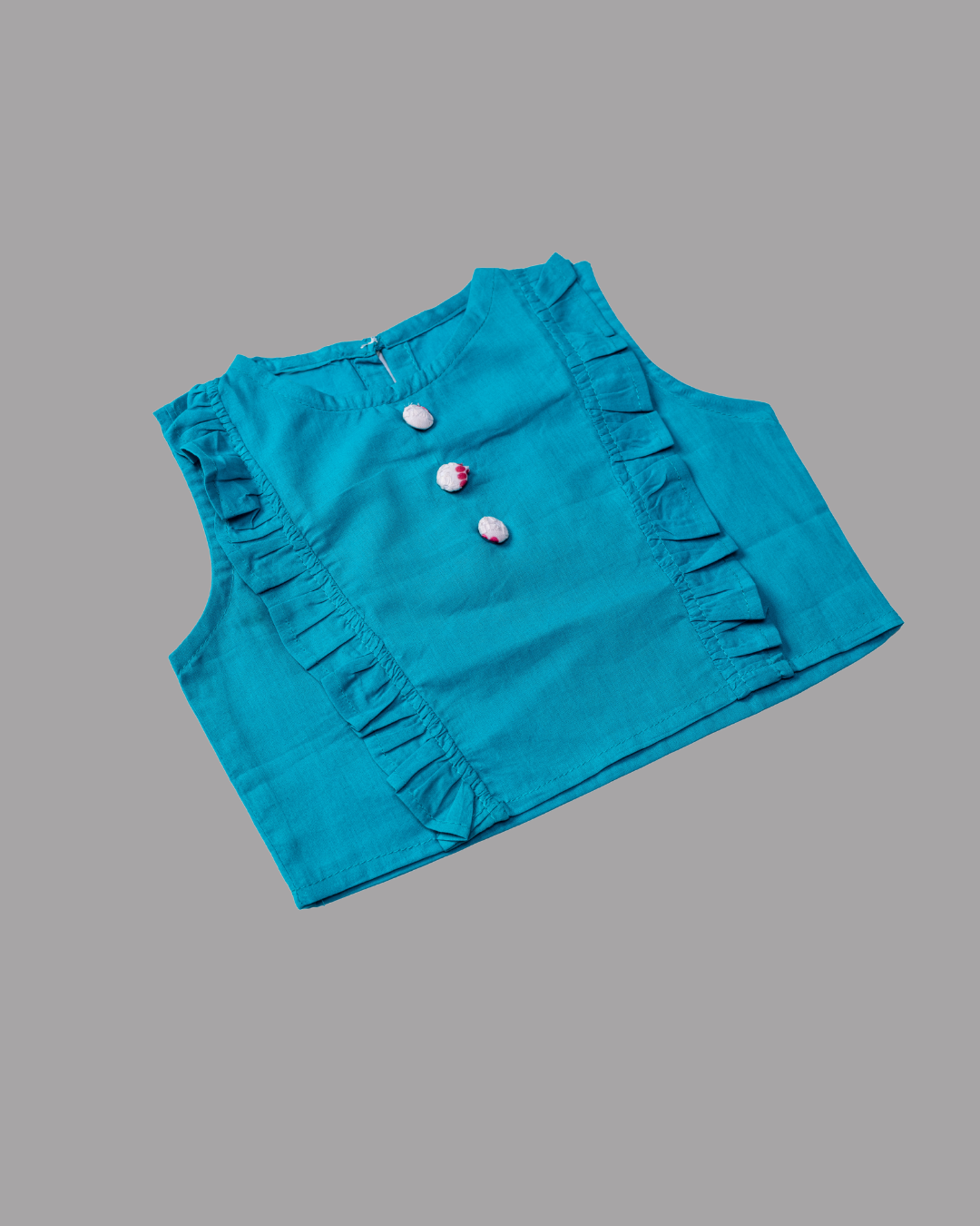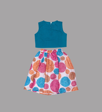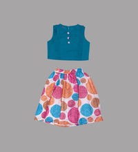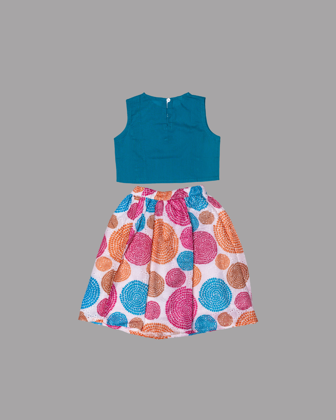 Brighten up your little one’s wardrobe with this charming teal and multicolor polka burst skirt set, a perfect mix of style, comfort, and cuteness. The sleeveless teal top for girls features adorable ruffle details and button accents for a touch of elegance, while the flared printed skirt for kids bursts with vibrant circular patterns in pink, orange, blue, and brown — adding a fun, colorful vibe to your child’s outfit.