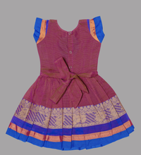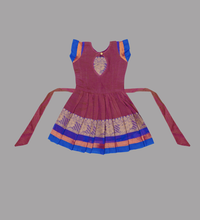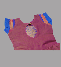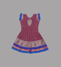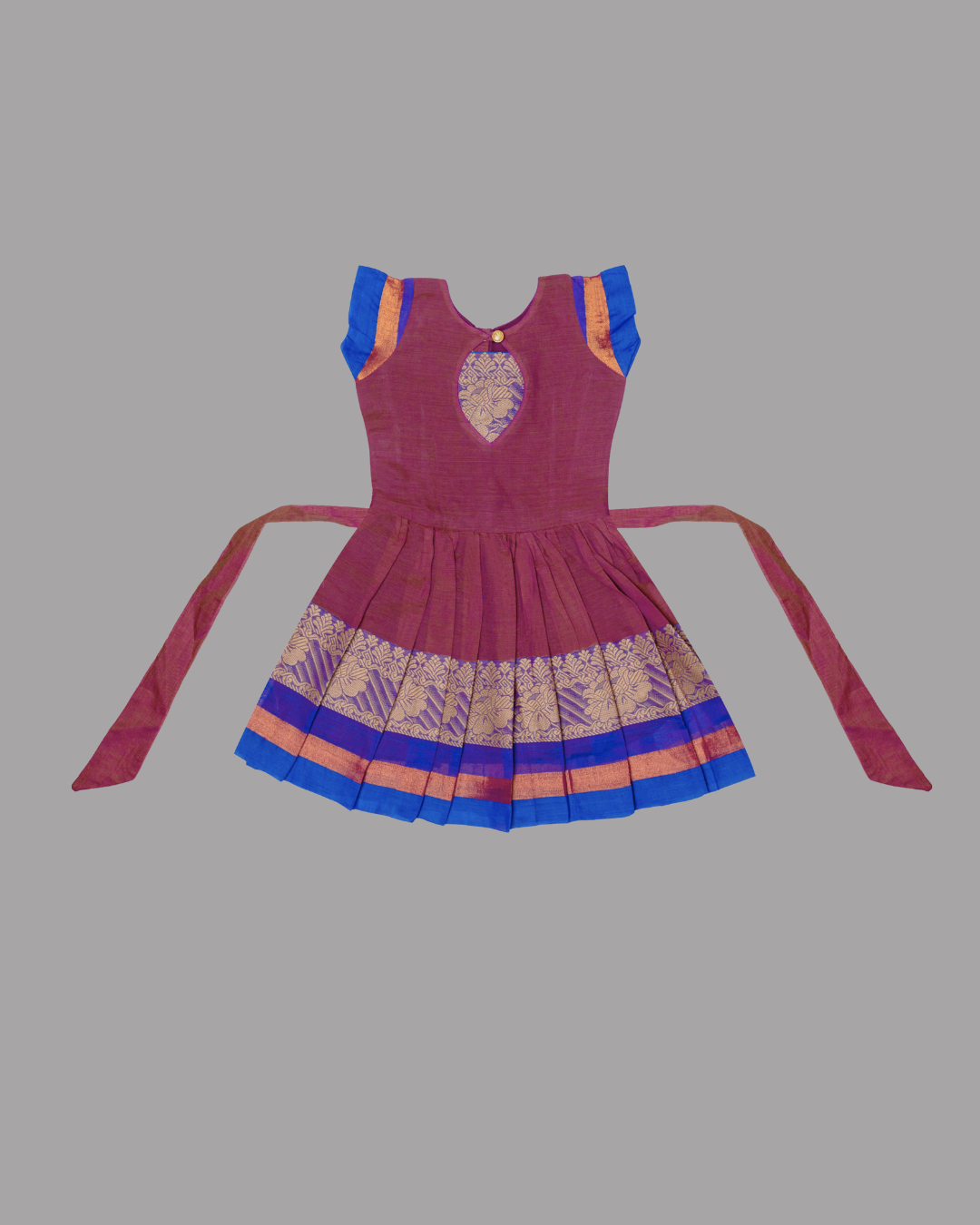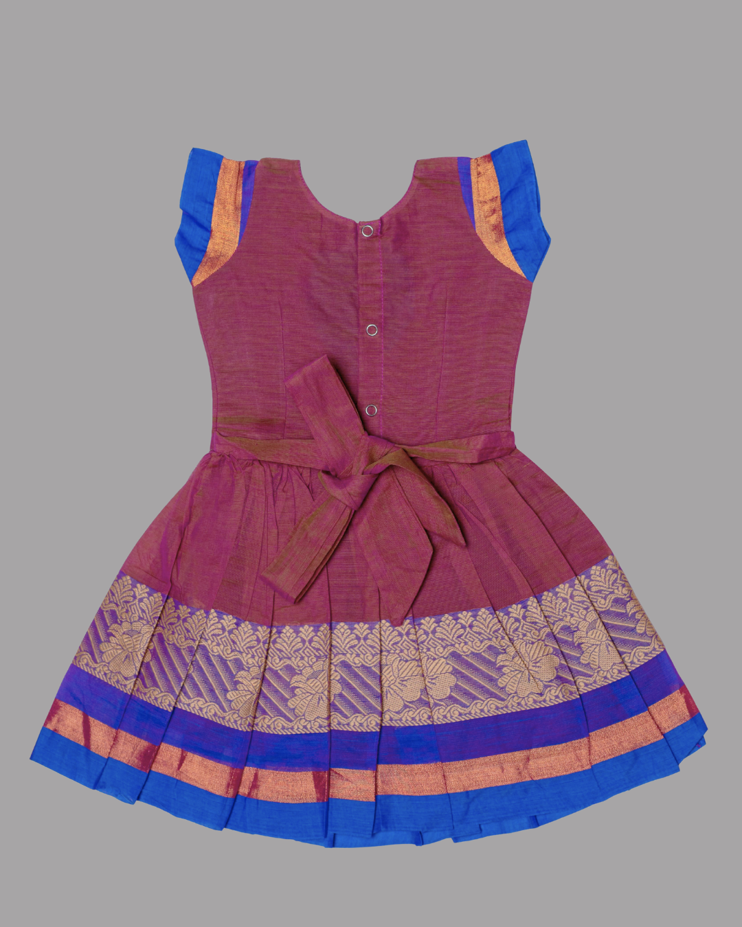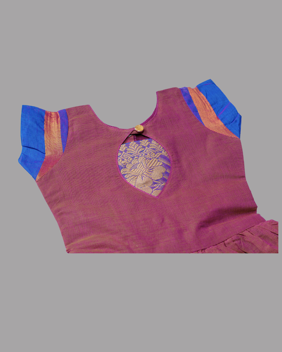 A perfect blend of tradition and comfort, this purple cotton frock is designed to make every festive occasion special. The rich royal blue sleeves and pleated border are highlighted with gold zari weaving, adding a regal touch. The frock features a delicate brocade motif on the yoke and soft pleats for graceful movement — ideal for little girls who love to twirl in style.